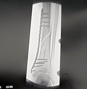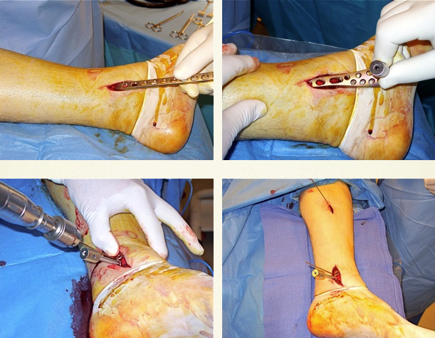 Se realiza una pequeña incisión sobre la cara interna del Tobillo y bajo control de Rx insertamos una placa de Titanio siguiendo el trayecto ascendente de la Tibia.